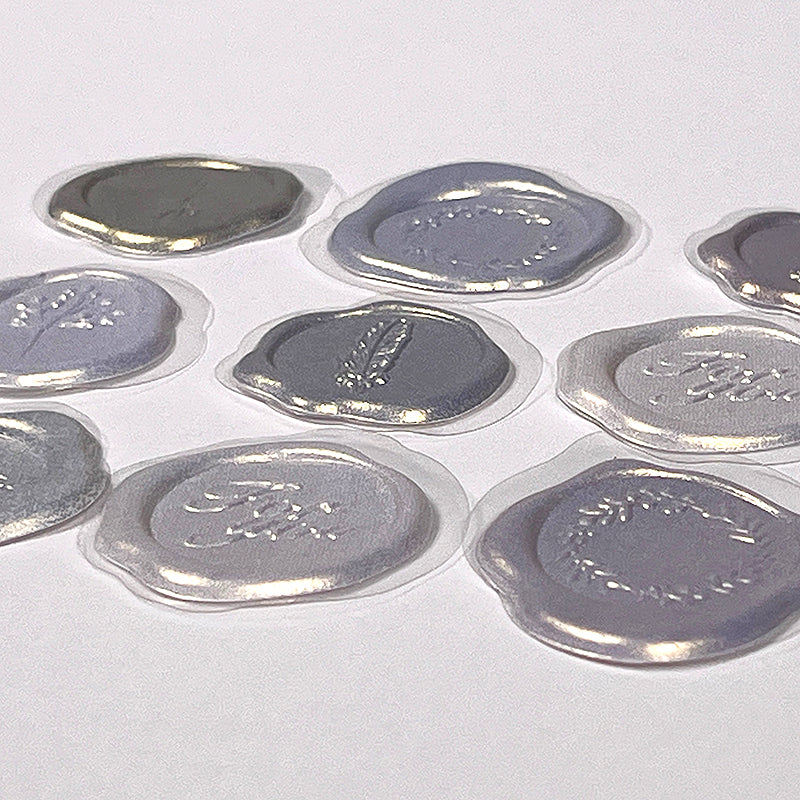 Package of nine self-adhesive faux wax seals. Each sticker measures approximately 1" in diameter. In shades of pearl, silver and metallic taupe. Sticker designs will vary.
