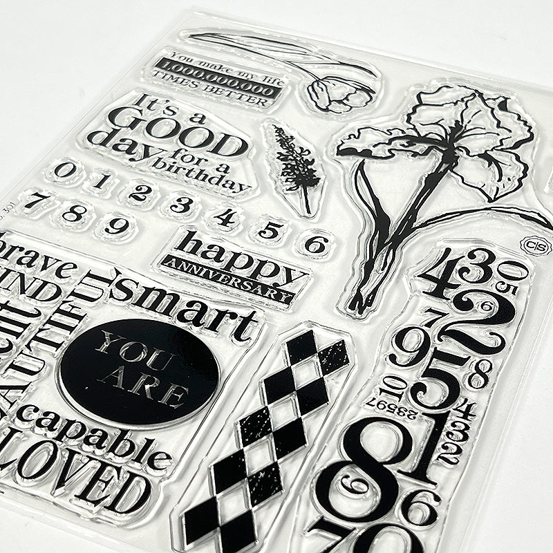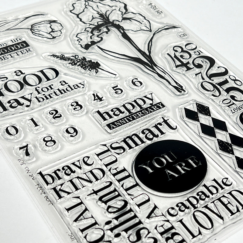 Our premium clear photopolymer stamps are ready to use; no prep is required. The stamp sheet measures 6x8" and includes 21 individual images and phrases.