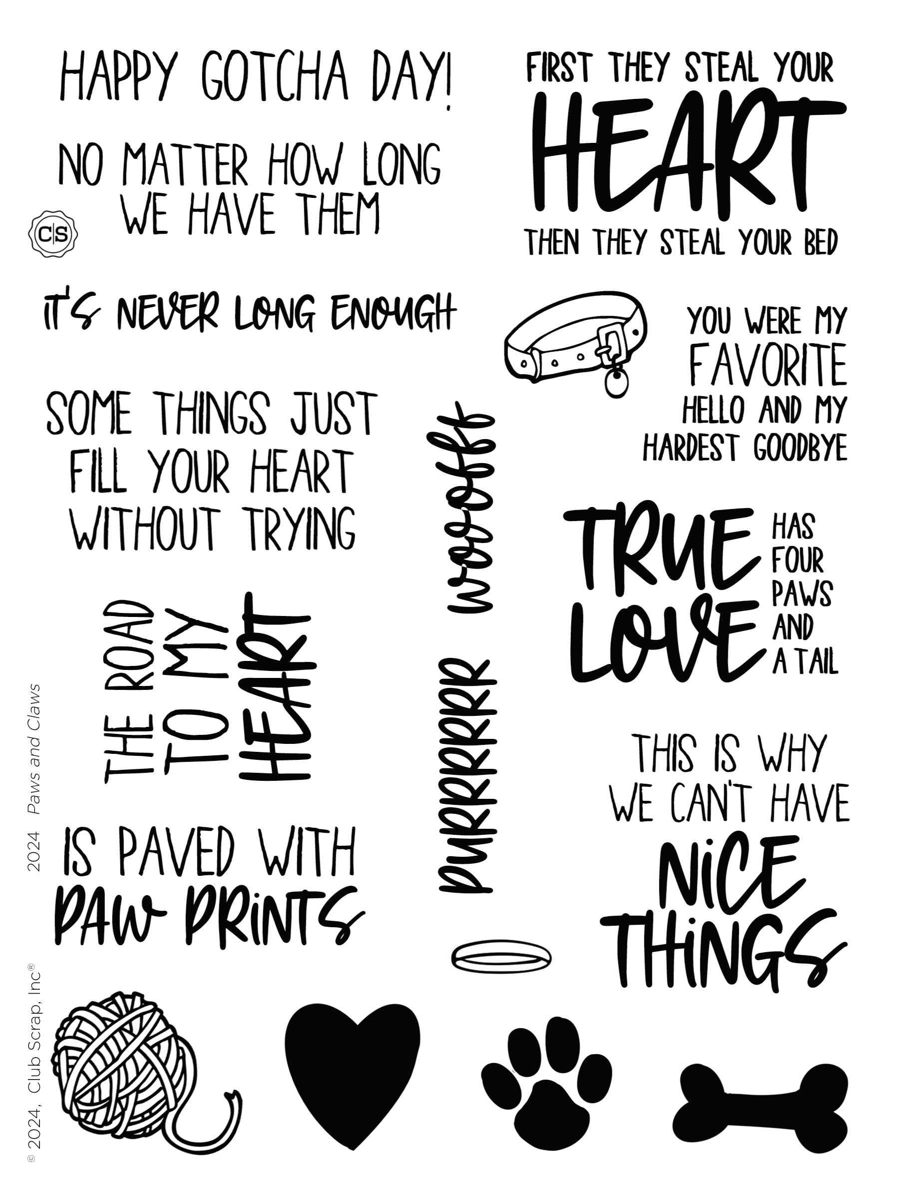 Our premium clear photopolymer stamps are ready to use; no prep is required. The stamp sheet measures 6x8" and includes individual images and phrases.